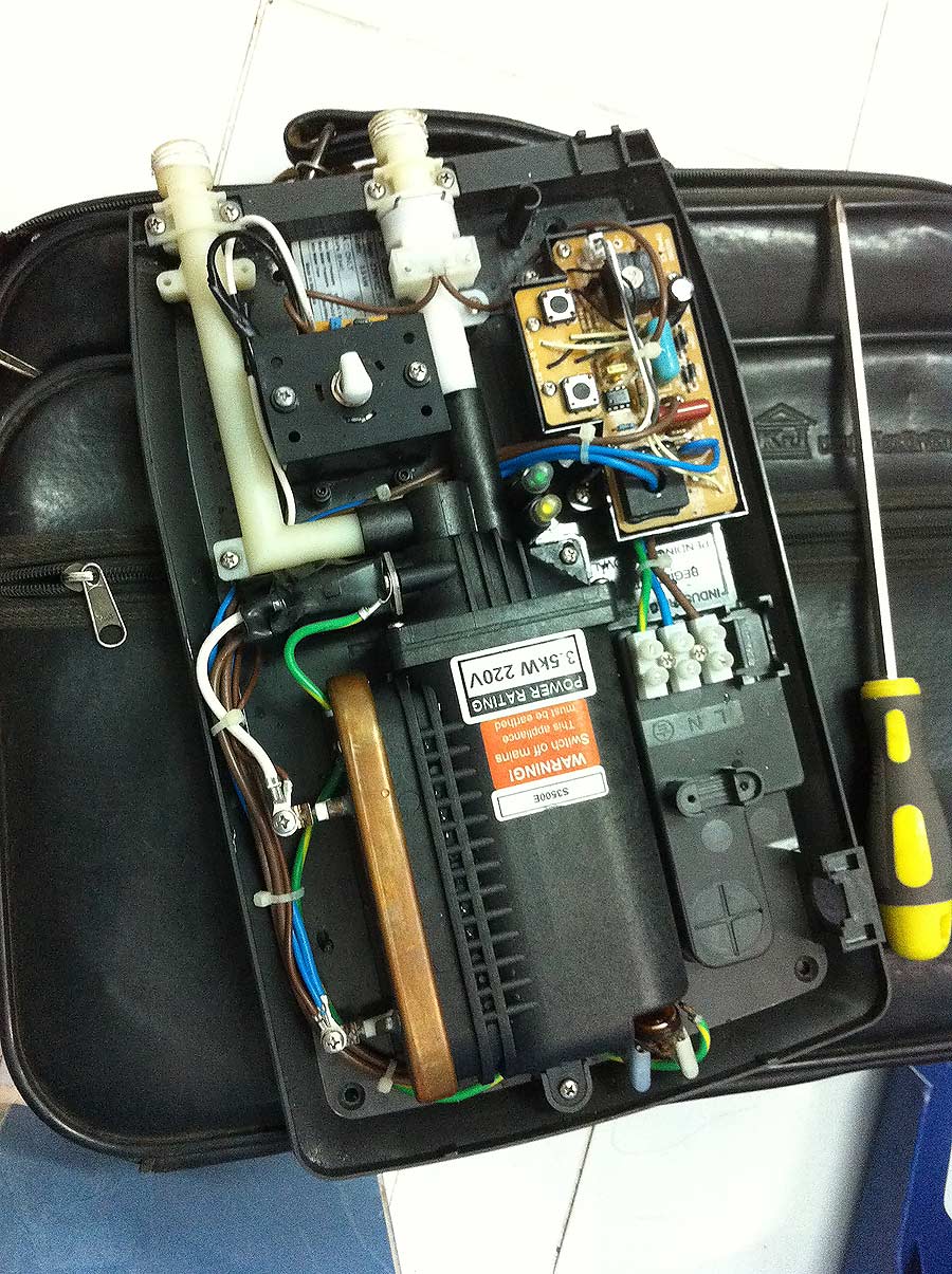 คงเสียภายในตัวเครื่อล่ะครับ ข้อต่อแตก ซีลหมดสภาพ หม้อต้มแตก ฯลฯ ลองถอดออกมาดูก่อนครับแล้วพิจารณาเอาว่าควรจะซ่อมดีหรือไม่ ถ้าเปลี่ยนก็เปลี่ยนเบรคเกอร์ด้วยนะครับ เอาเป็นแบบ ELCB