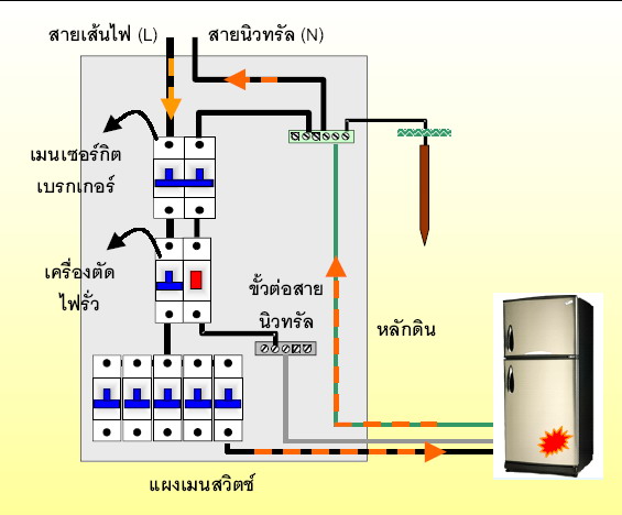 สาย N หลังจากต่อผ่านเครื่องตัดไฟแล้ว ห้ามสัมผัสกับสาย G หรือไปสัมผัสกับพื้นดิน-ผนัง