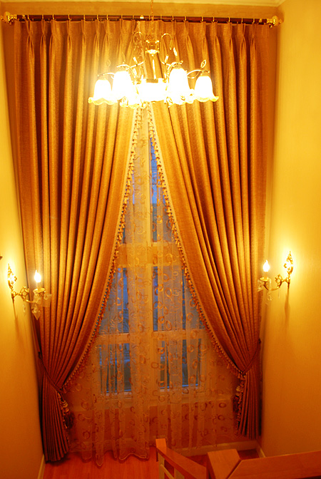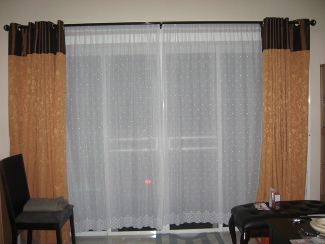 เราทำม่านราคาพอๆ กับที่จขกทหามาได้ค่ะ ผ้าที่เลือกตามแบบที่ชอบเรียบๆ ไม่ได้มีคุณสมบัติพิเศษอะไร ประตู ๕ บาน เป็นม่านจีบม้วน ทึบ โปร่ง โดย ๓ บานเป็นแบบม่านสูงจากฝ้าจรดพื้น อีก ๒ บานทำในกรอบประตูที่มีอยู่ หน้าต่าง ๑๘ บาน เป็นม่านพับ ทุกบานเป็นม่านจากฝ้าคลุมกรอบล่างหน้าต่างมาพอสมควร เป็นประมาณในรูปค่ะ